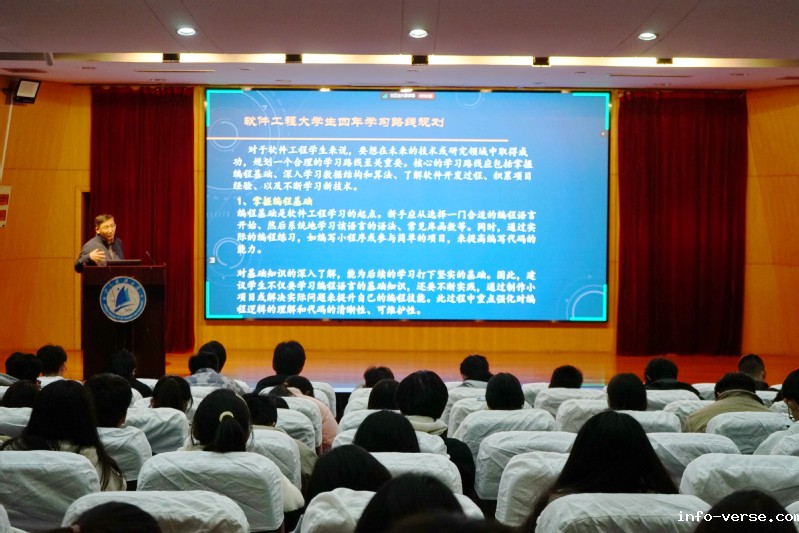 在分析行业现状的同时,束鑫老师还回顾了学校软件工程专业的发展历程。从2010年首次招生以来,该专业历经十余年积淀,不断优化教学模式,强化师资力量,取得了“江苏省一流专业”这一殊荣。束鑫老师表示,这离不开专业团队的辛勤付出和学生们的共同努力。通过先进的教学体系和丰富的实践平台,学校在为学生打牢编程基础的同时,也注重培养他们的创新能力和实践能力,助力他们在软件领域脱颖而出。