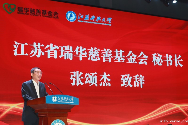 张颂杰秘书长对获奖学生表示热烈祝贺,对学校的学术底蕴和人才培养给予了高度赞扬。他介绍了江苏省瑞华慈善基金会的发展历程以及基金会在助学、助医、扶贫、赈灾等领域的公益慈善事业。五年来,瑞华慈善基金会与学校在人才培养、科研创新等多个领域展开合作,累计助力1160名学子成长成才。张颂杰殷切期望受表彰的优秀学子能够永怀感恩之心,牢记科技报国志,刻苦钻研,勇攀科学高峰,绽放青春光彩。