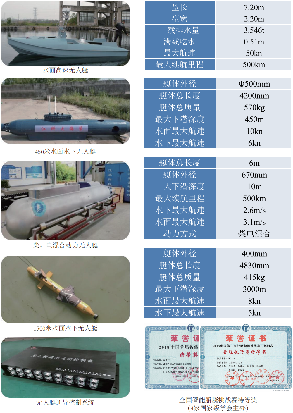 水面水下多功能无人艇包含不同尺寸和航速的水面无人艇、水面水下两用无人艇和深水无人艇。无人艇配置GPS、方位惯导设备、北斗设备、数传电台、X波段导航雷达、光电设备等通讯、导航、测量传感设备,实现人工控制、远程遥控及自主巡航,可应用河道巡查、海洋勘探、水文监测等多个领域。