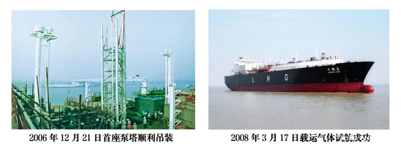 2008年4月3日,中国制造的第一艘液化天然气(LNG)船“大鹏昊”命名交付,总长292米,宽43.35米,型深26.25米,航速19.5节,装载量达14.7万立方米,是当时世界上最大的薄膜型LNG船。其成功交付标志着中国造船人首摘造船“皇冠上的明珠”,中国船舶工业实现LNG船“零”的突破,填补了中国LNG船生产设计、自主建造的空白,被国外船企垄断的大型LNG运输船制造终于打破。2018年,为庆祝改革开放40周年,中国邮政发行的小型张《筑梦新时代》上,“大鹏昊”LNG船位于天安门右侧“劈波斩浪”,寓意承载中华民族伟大复兴梦想的中华巨轮乘着新时代的浩荡东风,朝着“两个一百年”奋斗目标、中华民族伟大复兴的中国梦扬帆远航、奋勇向前。