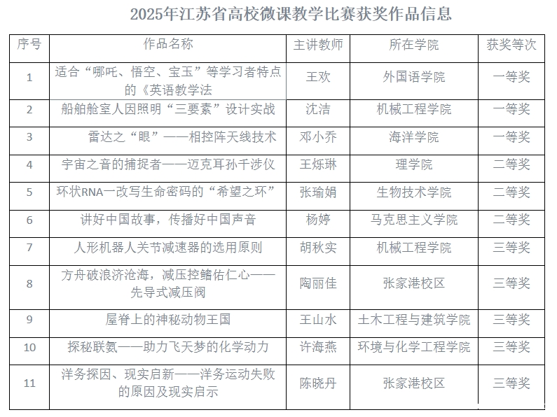 近日,江苏省高等学校教育信息化研究会公布了2025年江苏省高校微课教学比赛结果。我校参赛作品再创佳绩,在推荐的12项作品中有11项获奖。其中,外国语学院王欢等3位教师斩获一等奖,理学院王烁琳等3位教师荣获二等奖,机械工程学院胡秋实等5位教师摘得三等奖,成绩位居全省前列。