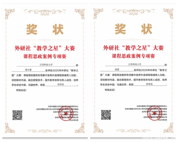 近日,2025年外研社“教学之星”大赛课程思政案例专项赛获奖名单正式公布。外国语学院多位教师凭借扎实的专业功底、创新的教学设计和深厚的课程思政育人理念,在主赛道中表现突出,取得历史性突破。蒋慧、谭方黎老师荣获特等奖;雷飞、曹莉、王蓓老师荣获一等奖;张学谦老师荣获二等奖;吴丹娜老师荣获三等奖。无论从获奖数量、等级,还是参与人数来看,均创学校参加该赛事以来最佳成绩,也位居省内高校首位。