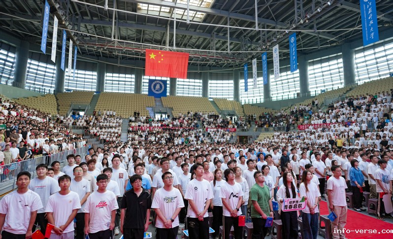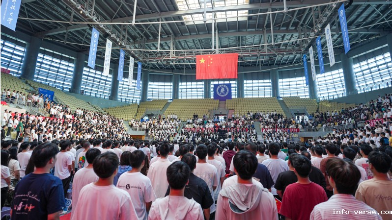 典礼在庄严的国歌声中拉开帷幕,全场师生肃立齐唱,会场气氛正式而热烈,新生们目光坚定,展现出昂扬的精神风貌。