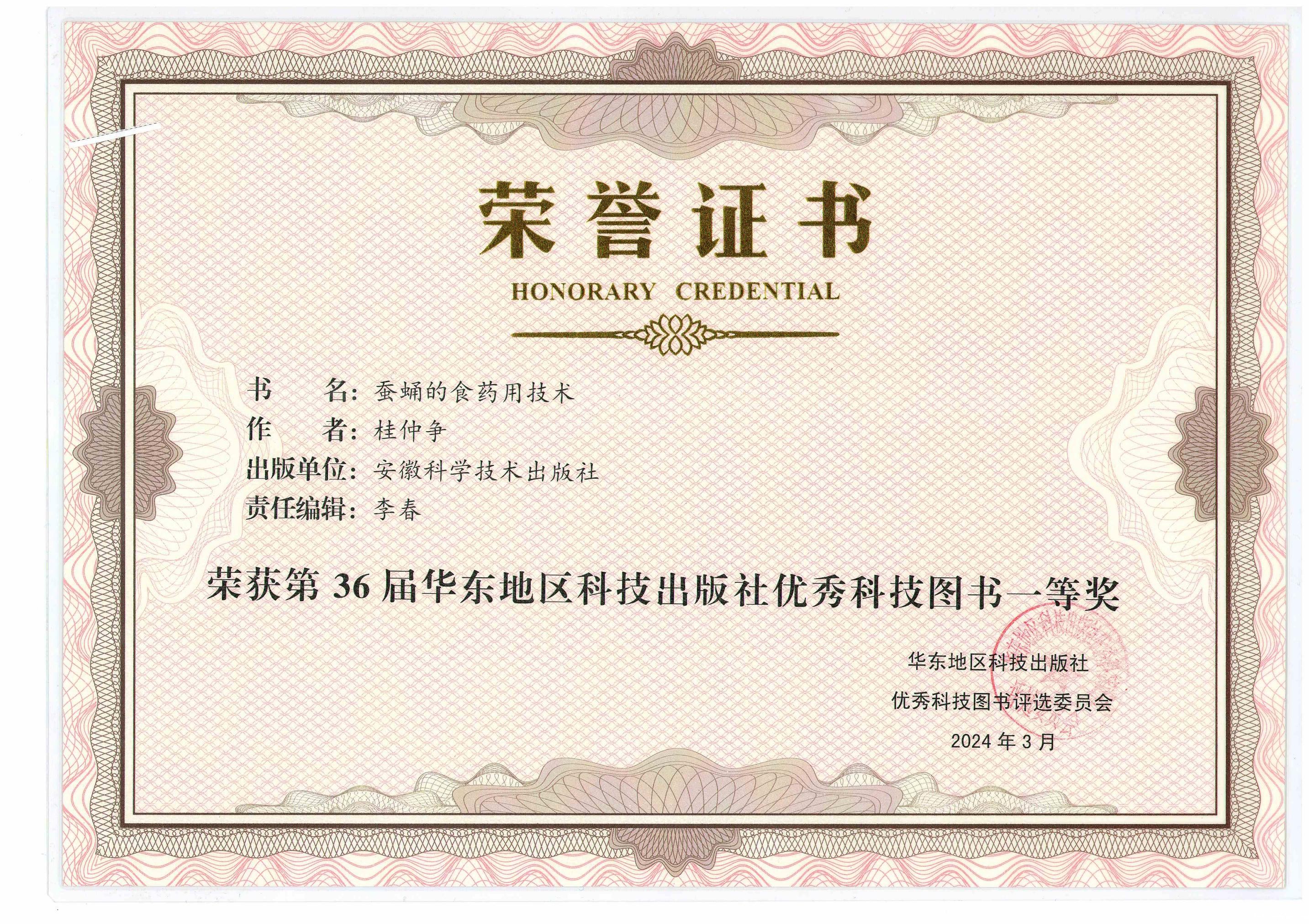 近日,第三十六、三十七届华东地区科技出版社优秀科技图书评选结果揭晓,我院桂仲争研究员专著《蚕蛹的食药用技术》荣获36届华东地区科技出版社优秀科技图书一等奖。该书系国家科学技术学术著作出版基金资助项目,由安徽科学技术出版社2022年出版发行。
