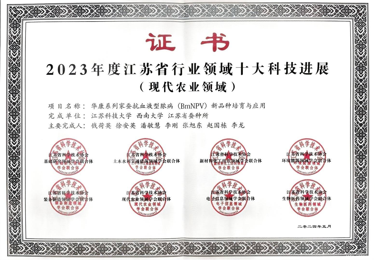 近日,江苏省8个学会联合体共同发布2023年度江苏省行业领域十大科技进展,我校联合西南大学、江苏省蚕种所研发的“华康系列家蚕抗血液型脓病(BmNPV)新品种培育与应用”成功入选(现代农业领域)。本次评选涵盖基础研究、环境能源、电子信息、装备制造、新材料化工纺织、土木水利交通建筑、生物医药、现代农业等八大领域,旨在全面展示江苏省在科技领域的最新成果和进步,激发广大科技工作者的创新活力。经提名、形式审查、初评、综合评审并向社会公示,遴选出具备高度创新性和应用价值、代表江苏省科技创新高水平的科技成果62项。