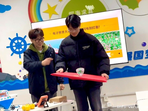 活动采用“观察-实践-创造”三段式教学模式,学生讲师钱奕丞以自制船模、水果电池实验、自平衡莱洛三角形带领小学员们走进“电的奇妙之旅”。当螺旋桨快速旋转、LED灯在生物电池驱动下成功发光时,小学员们通过可视化实验直观理解能量转化原理。在生活场景延伸环节,钱奕丞讲师通过情景式提问“现代生活缺电会怎样”,启发小朋友们建立电力供应与智能设备运行的基本关联。