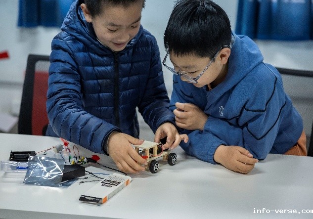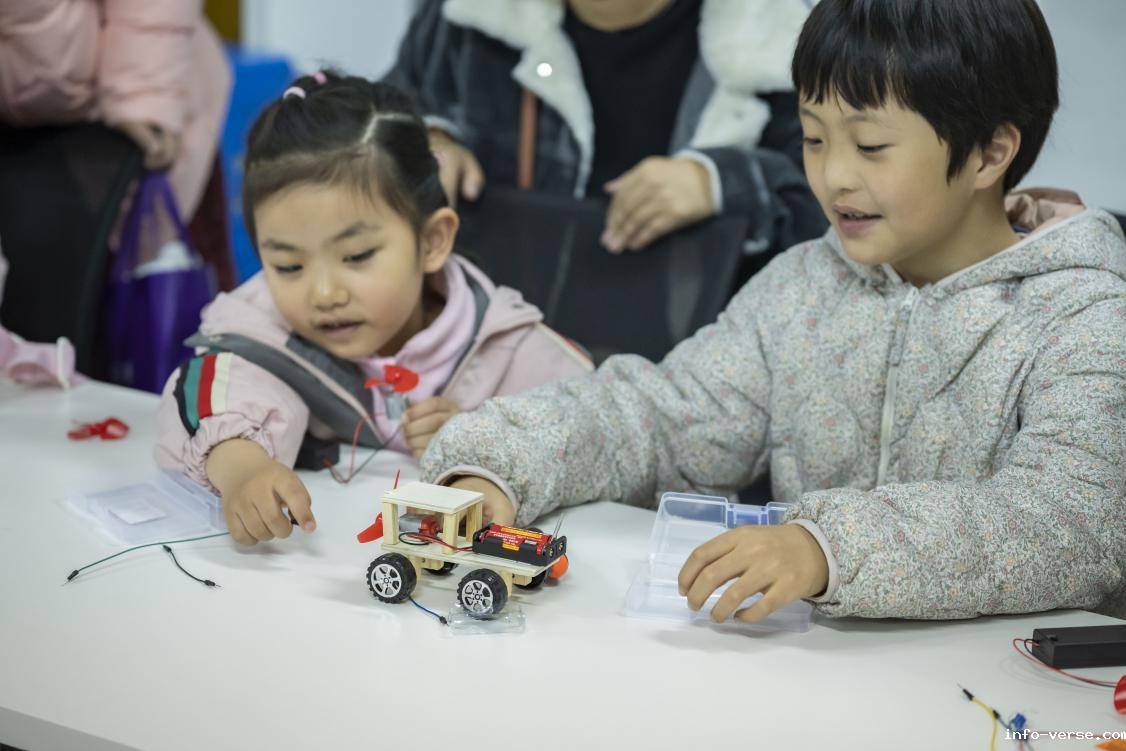 活动第二部分由主讲人万磊同学带来。他提问:“生活中还有哪些东西靠电机运转?”孩子们分组在教室内“寻宝”,寻找隐藏的电机设备——空调、电视、风扇……最后,他们利用简易材料(电池、电机、轮子)完成电动模型组装,当自制的小风扇旋转、玩具车启动时,现场通过成果展示强化小学员们的知识获得感。课程现场反馈良好,家长杨女士表示:“大学生讲解细致,课程生动有趣,精彩纷呈,小朋友很喜欢。”