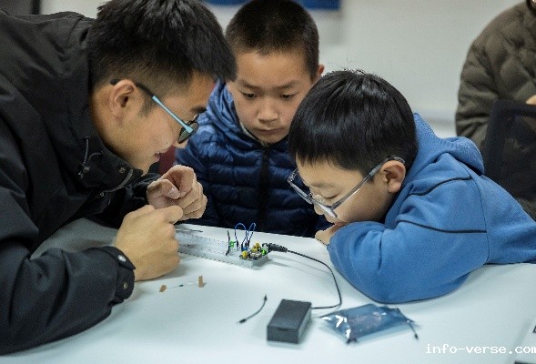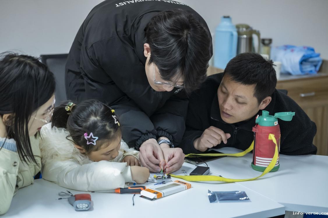 随后,学生讲师团队采用趣味教具套装一对一指导小学员,在讲师“手把手”教学下,用童趣化语言讲解连接要领,小朋友们用面包板完成了基础闭合电路搭建。当第一个串联电路成功点亮灯泡时,孩子们兴奋地举起作品互相展示。讲师团队同步讲解安全用电知识,强化小学员们用电的安全意识。