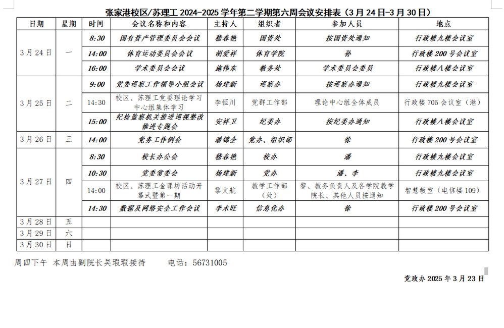 张家港校区/苏理工2024-2025学年第二学期第六周会议安排表(3月24日-3月30日)
