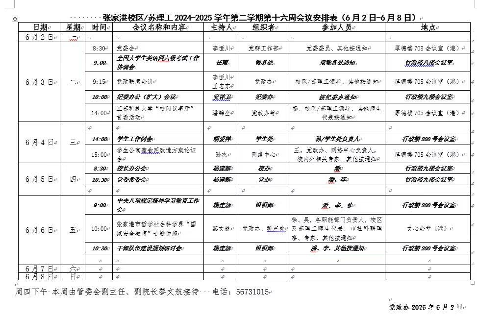 张家港校区/苏理工2024-2025学年第二学期第十六周会议安排表(6月2日-6月8日)