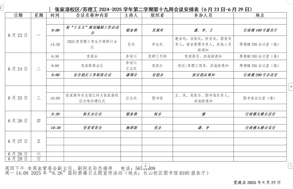 张家港校区/苏理工2024-2025学年第二学期第十九周会议安排表(6月23日-6月29日)